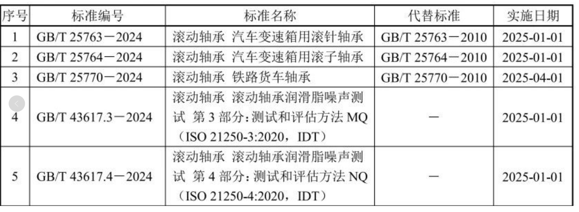 2024年9月29日,国家市场监督管理总局、国家标准化管理委员会以2024年第22号中华人民共和国国家标准公告批准发布了511项国家标准,其中滚动轴承行业5项。标准编号、标准名称及实施日期如下:
